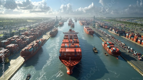 Design a photorealistic digital scene showcasing a birds eye view of multiple cargo ships being meticulously coordinated in a busy port