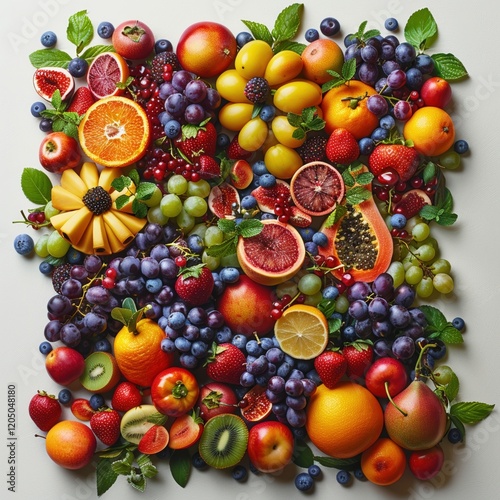 Design a visually striking front view featuring an assortment of fruits that vividly embody