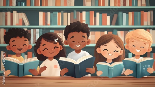 Design an image with diverse children reading together, highlighting the importance of local schools, selective focus, inclusivity theme, whimsical, Multilayer, public library backdrop