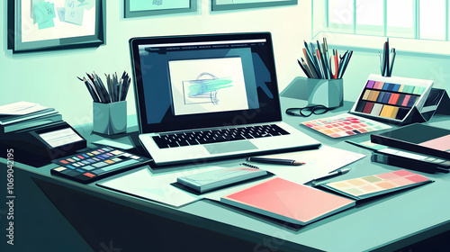 Designer's desk with laptop, pencils, color palettes, and notebooks.