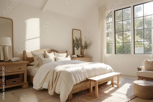 Designing a Serene Bedroom: Natural Light, Neutral Tones, and Wooden Furniture Create a Calming Sanctuary with Textured Textiles and Simple Decor, Enhancing Relaxation and Tranquility.