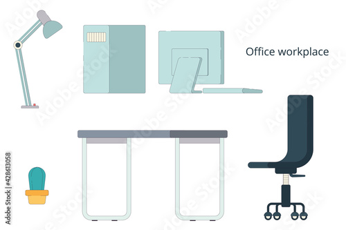 workplace, illustration, home, monitor, cartoon, table, vector, design, flat, modern, desktop, computer, icon, desk, work, office, corporate, chair, business, concept, job, background, creative, view, professional, workspace, technology, lamp, graphic
