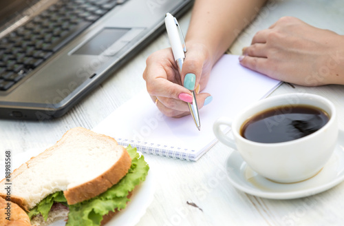 desktop, worktop, table, workplace, lunch, food, people, girl, hand, work, computer, laptop, hot drink, sandwich, apple, herb, plant, fresh air, rest, lifestyle, cyberspace, time, employment, pen, notebook, writing, document, business, woman, office, break, coffee break