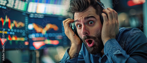 Desperate shocked stressed business man stock trading market investor or financial broker, businessman trader feeling panic about money loss, stock market fall, economic recession or bankruptcy.