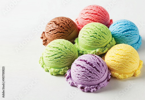 Dessert stock image. Colorful Gelato Scoops on white background. Good for dessert restaurant, point, marketing poster, banner or social media post. Symbol of joy, celebration, happiness.