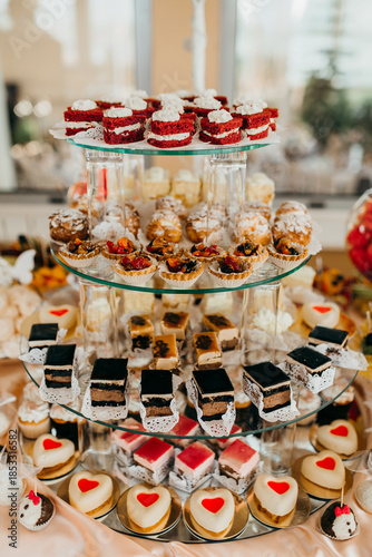 dessert, pastry, cake, sweet, party, celebration, wedding, event, food, catering, buffet, banquet, variety, indulgence, sugar, delicious, epicure, confectionery, treat, chocolate, red, velvet, fruit, tart, cream, cotton balls, festive, elegant, display, sweet, table, mini, patisserie, baked, good, bakery, assortment, selection, decoration, taste, enjoyment, special, occasion, reception, serving, colourful, deliciously, bar, nobody
