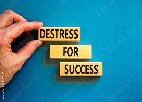 Destress for success symbol. Concept words Destress for success on wooden blocks. Doctor hand. Beautiful blue background. Psychological business and destress for success concept. Copy space.