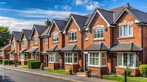 residential area, housing, architecture, suburb, england, real estate, neighbourhood, property, british, city landscape, rooftop, traditional, urban, exterior, brick, window, door, fence, chimney, tree, garden, street, perspective, skyline