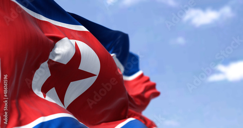 Detail of the national flag of North Korea waving in the wind on a clear day
