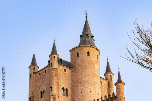 Detail of towers of The Alcazar of Segovia in Castilla y Leon, Spain