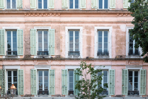 detail of typical French house, pink with green shutters in Antibes, Cote d'azure or French Riviera. South of France