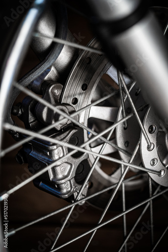 Detail of wheel and disc brakes of modern motorcycle