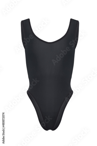 Detail shot of a black nylon bodysuit with open hips. Sexy tight-fitting lingerie is isolated on the white background.