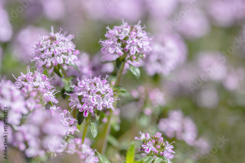 Detail shot of blooming mountain savory (Satureja montana). Copyspace.