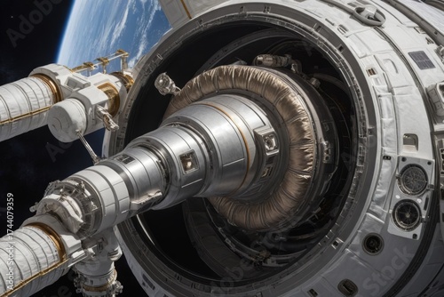 Detailaufnahme einer Raumstation im Orbit mit fortschrittlicher Technologie und Blick auf die Erde