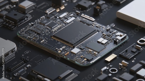 Detailed 3D render of a disassembled mobile phone's electronic chip and CPU, highlighting the internal technology and components