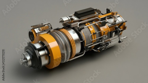 Detailed 3D render of a futuristic, yellow and grey engine, showcasing intricate internal mechanisms and components.
