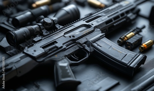 Detailed 3D render of a modern assault rifle with attachments like scopes and silencers, sleek and tactical