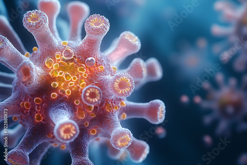 Detailed 3D rendering of a virus molecule with prominent red spike proteins, emphasizing its structure against a dark, blurry background.