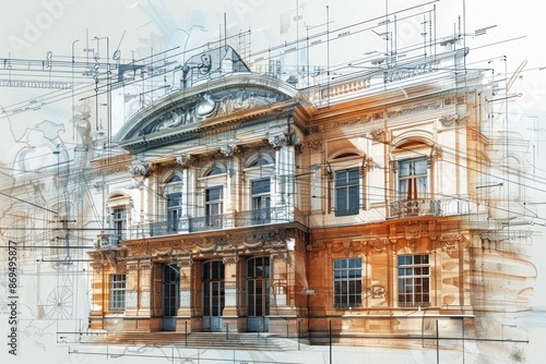 Detailed architectural drawing of a historical building, combining elements of blueprint and art.