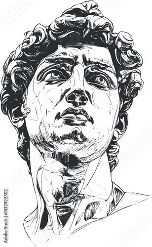 Detailed black and white illustration of a classical marble sculpture head showing strong facial expression and artistic carving