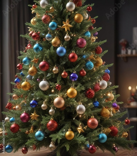 Detailed Christmas tree with colorful ornaments on branches, wooden star, holly berries