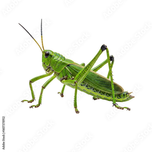 Detailed close up of a green grasshopper with long antennas isolated on transparent background
