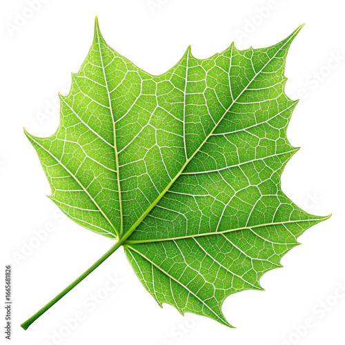 Detailed close up of a vibrant green maple leaf with intricate vein patterns isolated on transparent background