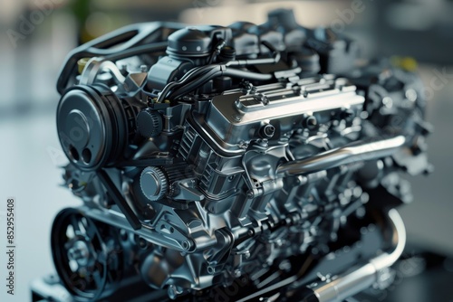 Detailed close up of modern car engine design showcasing advanced cross section view