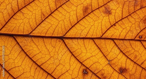 Detailed close-up of a decaying orange autumn leaf showing the intricate network of veins and textures of the seasonal transition ,organic ,change ,network