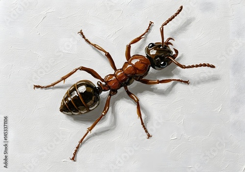 ant, insect, painting, art, artwork, closeup, macro, detail, nature, wildlife, bug, creature, animal, illustration, entomology, photo, artist, design, graphic, texture, white background, red, brown, leg, antennae, head, body, segmented, fine art, canvas, realistic, detailed, hi-res