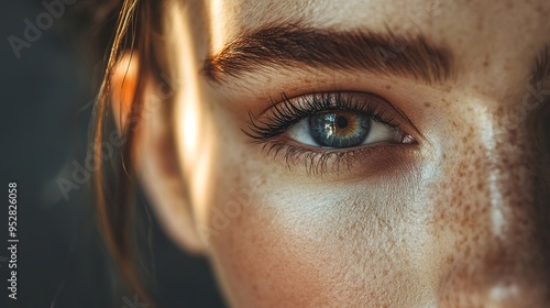 detailed close-up of a woman's face with flawless makeup and a confident gaze, capturing the essence of modern glamour