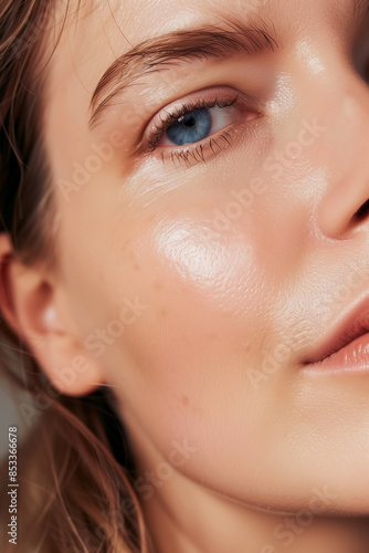 Detailed Close-Up of a Young Woman in Her 30s with Glowing, Healthy Skin, Without Makeup