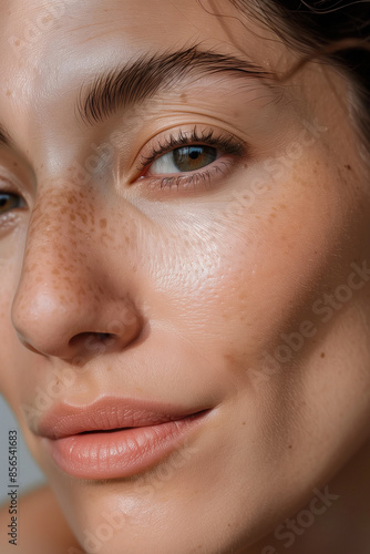 Detailed Close-Up of a Young Woman in Her 30s with Glowing, Healthy Skin, Without Makeup