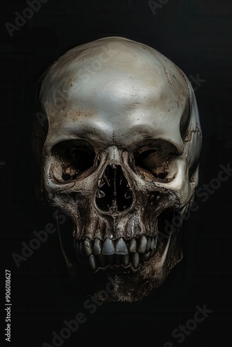 skull, human, bone, ancient, closeup, dark, lighting, chiaroscuro, eerie, grisly, mysterious, detailed, haunting, anatomy, death, grim, cryptic, forensic, creepy, morbid, antique, gothic, grunge, shadow, black, grey, weathered, old, mystery, study, science, archaeology, anthropology, historical, evidence, museum, collectable, vintage