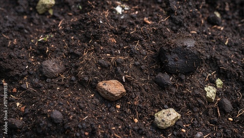 Detailed closeup of dark moist soil texture and grains