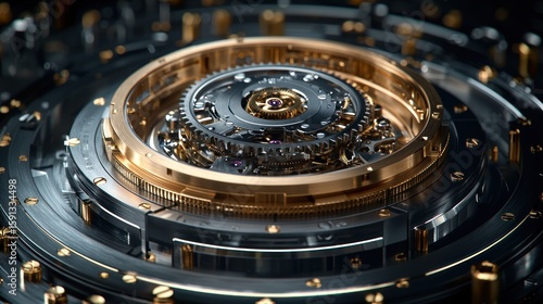 clockwork, mechanism, gear, intricate, precision, engineering, artistry, gold, metal, dark, layered, component, detailed, closeup, circular, concentric, ring, design, movement, horologe, technology, complex, modern, mechanical, rotating, luxury, watch, system, machinery, detail, engine, part, motion, art, metalwork
