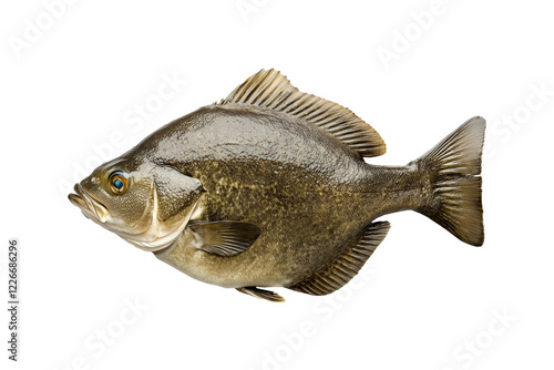 Detailed closeup of Pacific Halibut fish with shiny scales, fins and tail isolated on white transparent background, concept of marine life