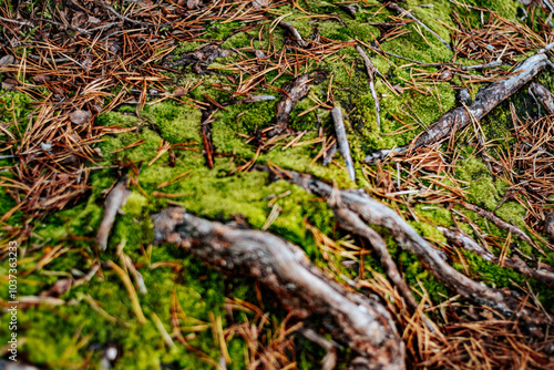 Detailed close-up of the forest floor with bright green moss, scattered pine needles and exposed tree roots. Earth textures create a rich, natural atmosphere.