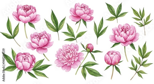 pink, peony, flower, leaf, botanical, illustration, watercolor, collection, design, element, set, floral, spring, summer, nature, delicate, blossom, bud, green, pastel, arrangement, isolated, drawing, high-coloured, pretty, decorative, pattern, graphic, art, hand, painted, romantic, vintage, composition, decor, detailed, various