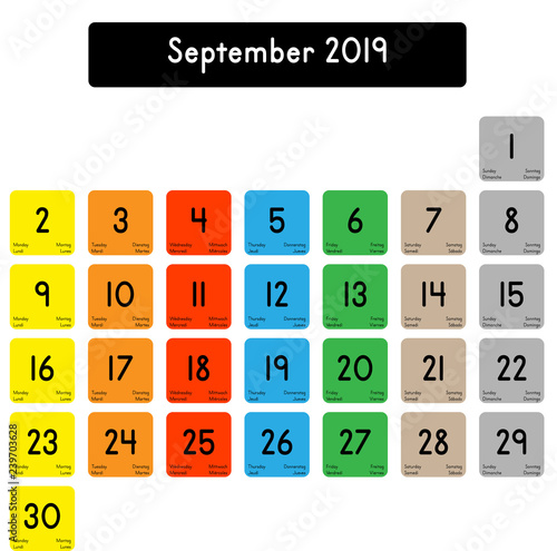 calendar, september, month, 2019, vector, year, daily, illustration, design, template, white, new, simple, modern, graphic, background, date, event, week, planner, business, schedule, element, day, monday, tuesday, wednesday, th, friday, sunday, colourful, yellow, red, blue, green, brown, black