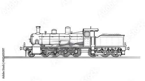 Detailed Drawing of a Vintage Steam Locomotive Train Engine with Classic Industrial Design and