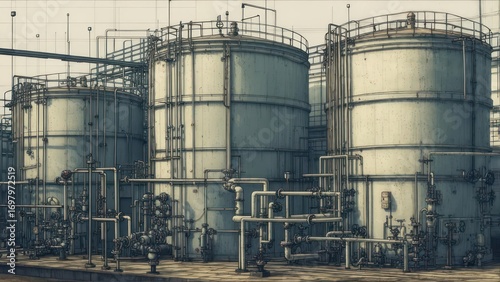 Detailed Graphic Illustration of Industrial Storage Tanks and Complex Piping System at a Chemical Plant