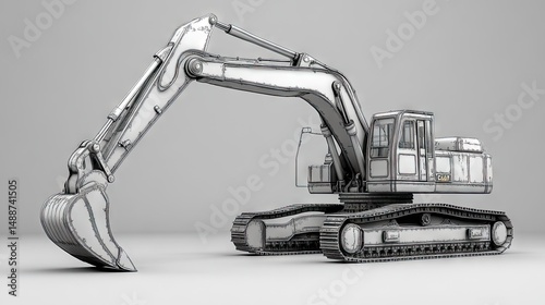 greyscale, rendering, construction, vehicle, heavy, machinery, shoveling, industrial, equipment, outline, three-dimensional, model, illustration, design, metal, machine, profile, side, view, perspective, technical, detail, engineering, diagram, image, drawing, graphic, grey, white, line, contour, shadow, light, isometric, modern, contemporary
