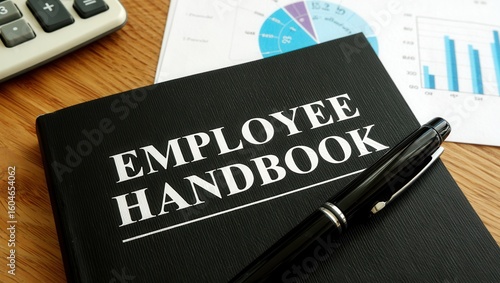Detailed guide for new hires on company policies and procedures with charts and calculator on desk