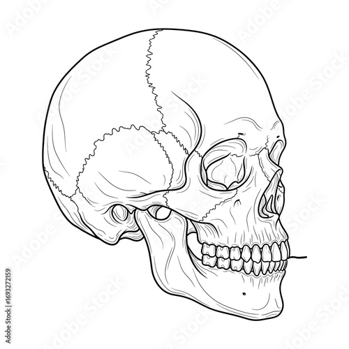 skull, illustrating, line art, drawing, anatomy, human, skeleton, bone, skull, jaw, lower jaw, teeth, anatomical, medicals, scientific, educational, structure, head, profile, isolated, white background, detailed, artwork, vignetting, doodle, representation, cranial, orbital, temporal bone, frontal bone, occipital bone, suture, incisor, canino, premolar, molar, illustration, black-and-white, design element, clip art, graphic, single object