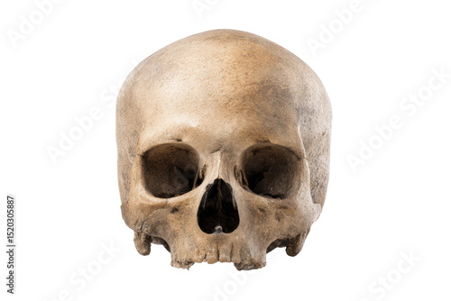 Detailed human skull on black background highlighting bone structure, cut out