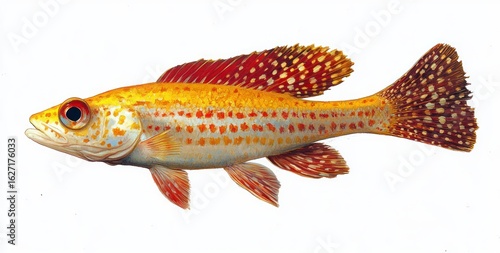 Detailed illustration of a colorful small fish with orange, yellow, and red spotted patterns and prominent fins on a white background