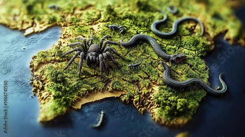 map, illustration, reptile, spider, detail, texture, green, mossy, landscape, animal, creature, land, ocean, dark, light, surface, three-dimensional, design, nature, geography, wildlife, flora, fauna, ecosystem, spider's web, snake, insect, terrarium, insect, creepy, crawly, amphibian, element, environment, exotic, close, up, macro, graphic, modern