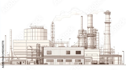 factory, industrial, complex, plant, manufacturing, production, industry, infrastructure, building, architecture, smokestack, pipe, equipment, machinery, technology, energy, power, refinery, steel, metal, chemical, processing, construction, engineering, design, illustration, drawing, vignetting, graphic, vector, image, picture, element, scene, view, perspective, background, white, sepia, toned, detailed, intricate, large, scale, massive